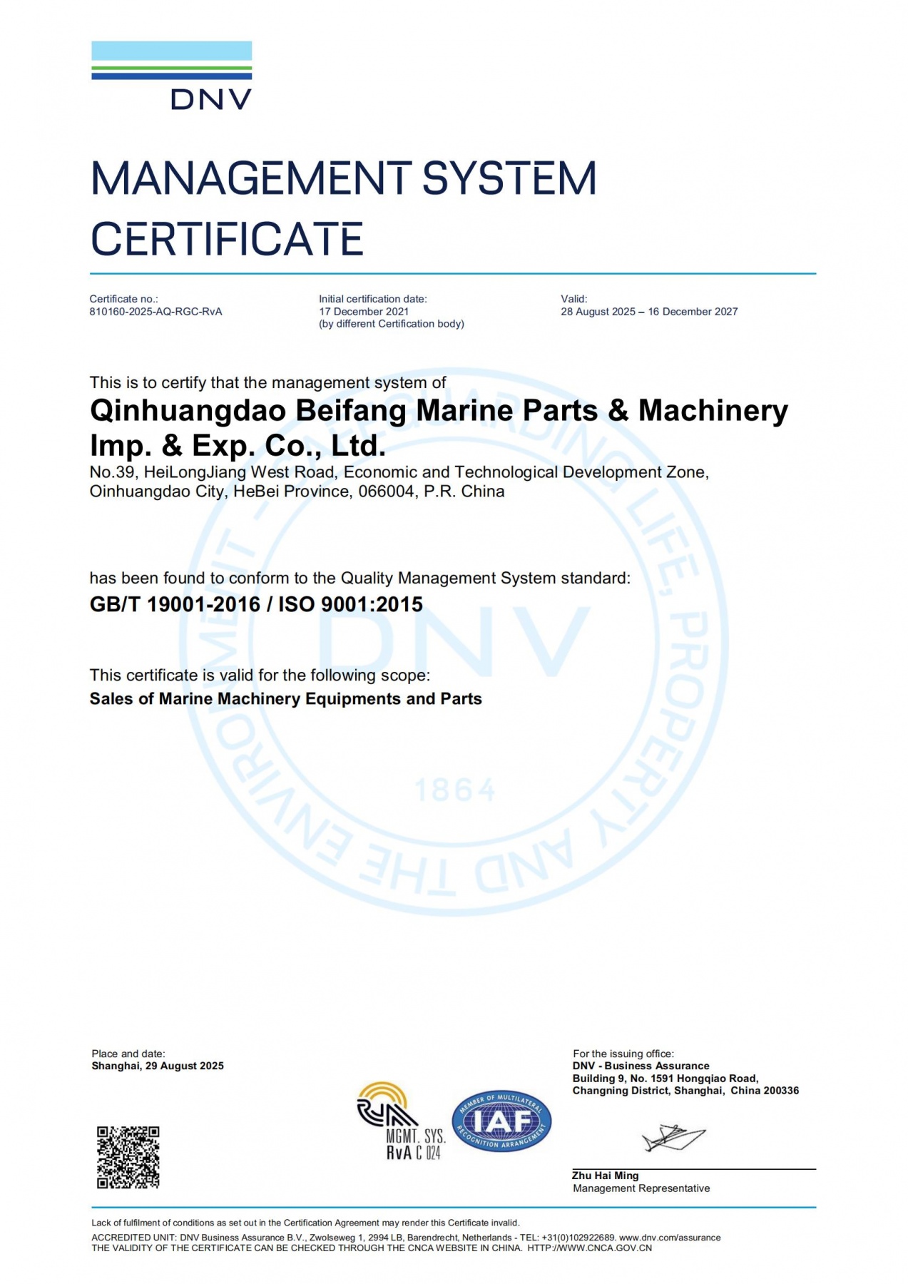 DNV Management System Certification Certificate