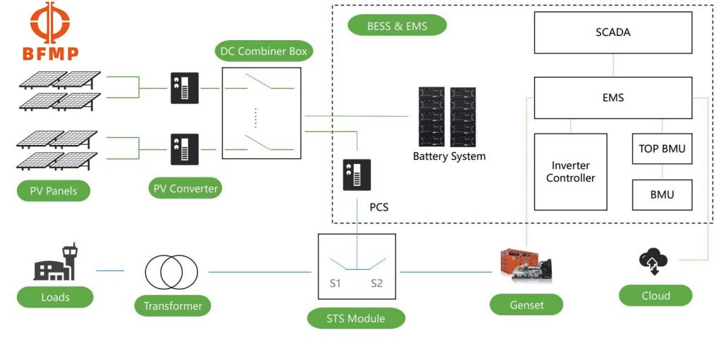 能量管理系統(tǒng)(EMS):智能調(diào)度各能源來源,優(yōu)先使用光伏,必要時(shí)啟動(dòng)柴油發(fā)電機(jī),確保供電連續(xù)性。