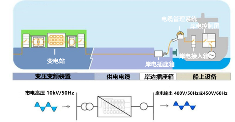 岸基裝置:安裝在碼頭或港口,用于向船舶提供岸電的設(shè)備,一般包括高壓配電柜,變壓器、變頻器(適用時)和碼頭岸電插座箱。