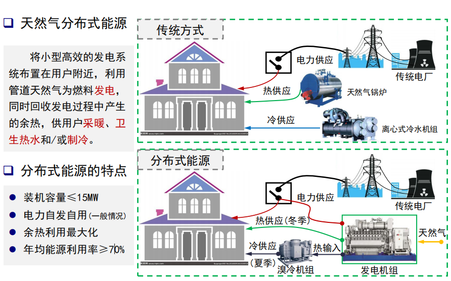 分布式能源是指分布在用戶端的能源綜合利用系統(tǒng)。它以天然氣等清潔能源為主要一次能源,通過冷熱電三聯(lián)供等方式實(shí)現(xiàn)能源的梯級(jí)利用,綜合能源利用效率可達(dá)70%以上。與傳統(tǒng)的集中式能源供應(yīng)相比,分布式能源具有更高的能源利用效率、更低的能源輸送損耗和更強(qiáng)的能源供應(yīng)靈活性。